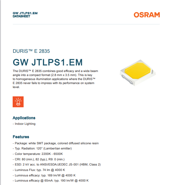 - Luminous Flux: typ. 74 lm @ 4000 K