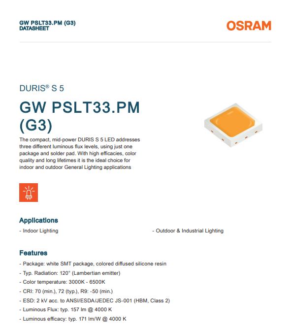 - Luminous efficacy: typ. 171 lm/W @ 4000 K
