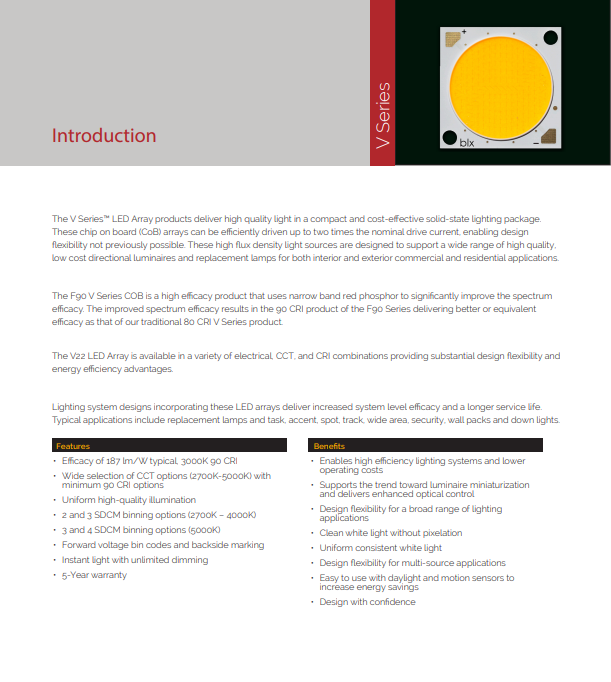 • Efficacy of 187 lm/W typical, 3000K 90 CRI