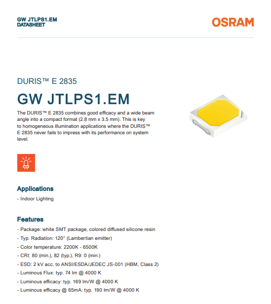 - Luminous Flux: typ. 74 lm @ 4000 K